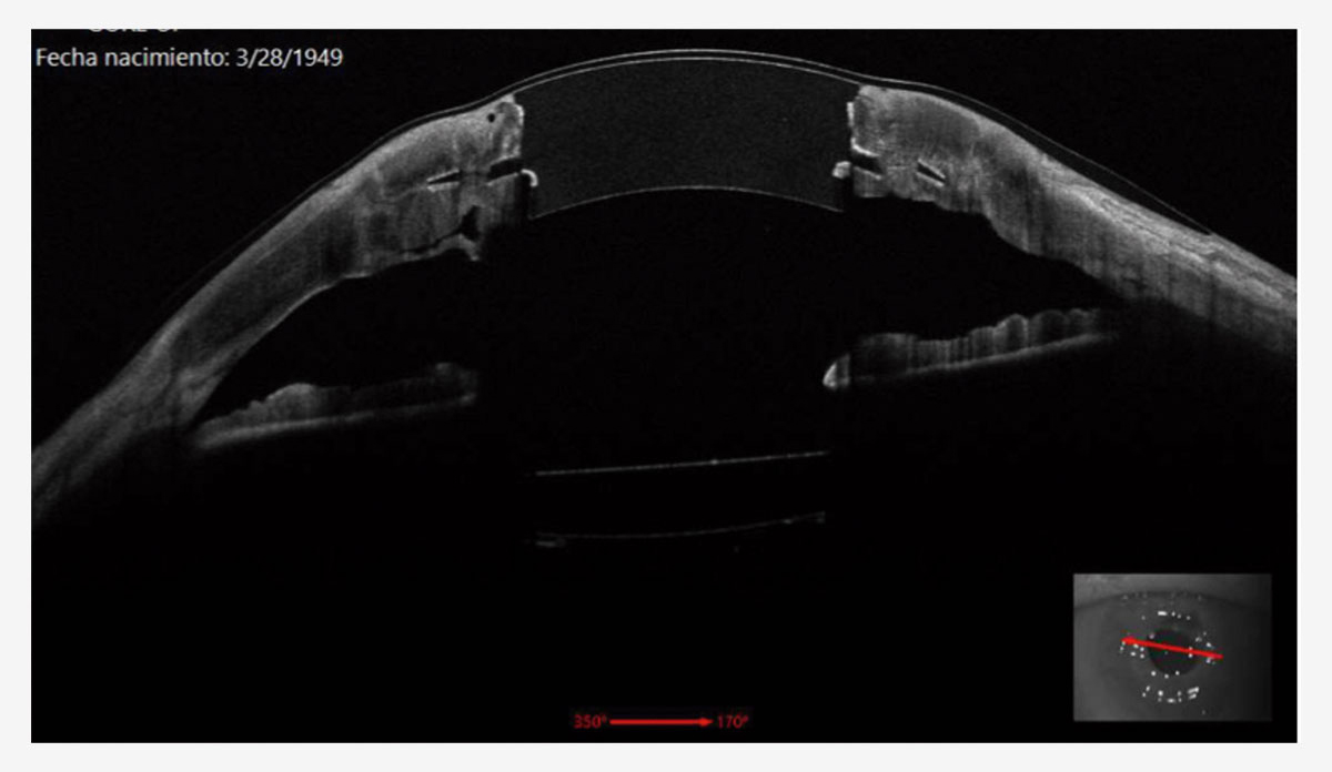 Figura 2. OCT de segmento anterior dispositivo sintético corneal de Gore. Un año después de su implante.