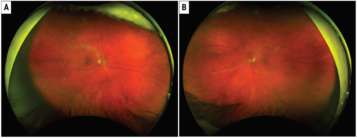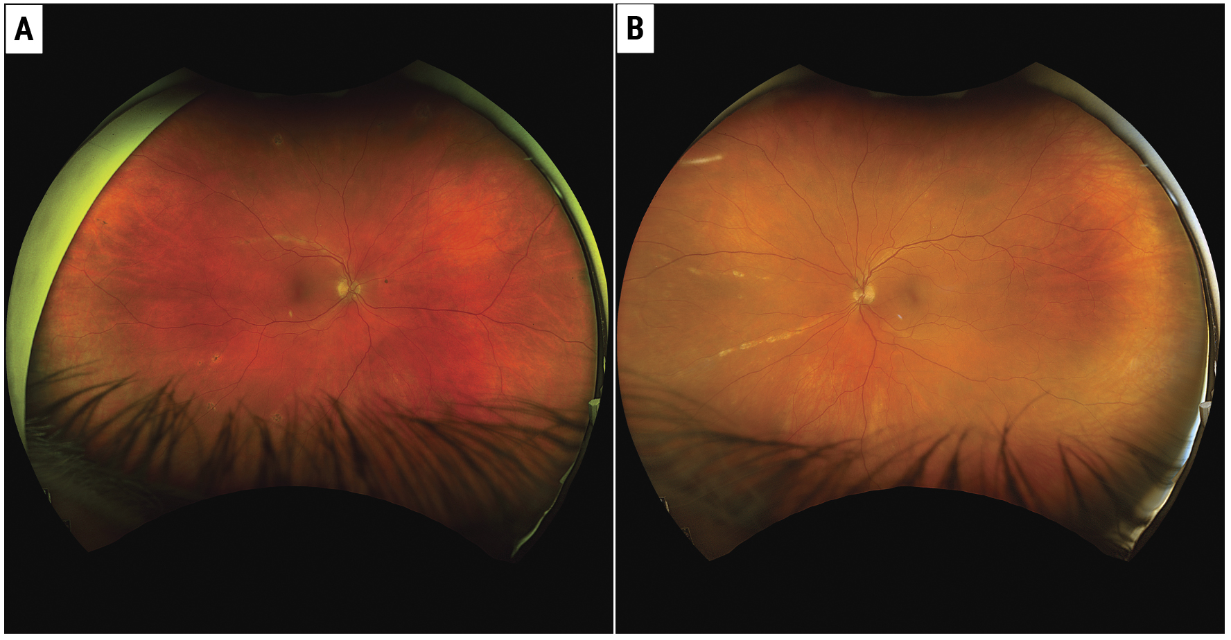Figura 4. Fotografía pseudocolor de campo ultraamplio del ojo derecho (A) e izquierdo (B) al mes de seguimiento, que evidencia mayor pigmentación de las lesiones coriorretinianas lineales y resolución de las lesiones coroideas hipopigmentadas en ambos ojos.