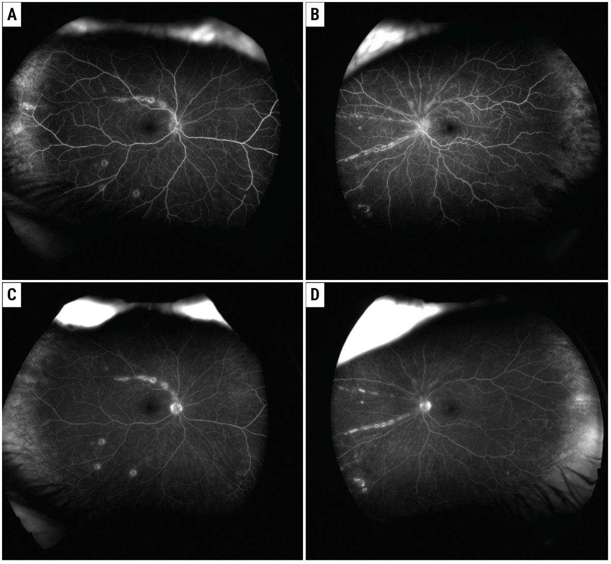 Figura 1. (A) Fotografía pseudocolor de campo ultraamplio del fondo de ojo derecho en la consulta inicial, que demuestra numerosas lesiones coriorretinianas dispersas y un menor número de lesiones coroideas hipopigmentadas en la periferia media. Se observan múltiples lesiones coriorretinianas pequeñas a lo largo de la arcada superior, dispuestas en un patrón lineal que irradia desde el nervio óptico y conectadas por una sutil estría coriorretiniana.