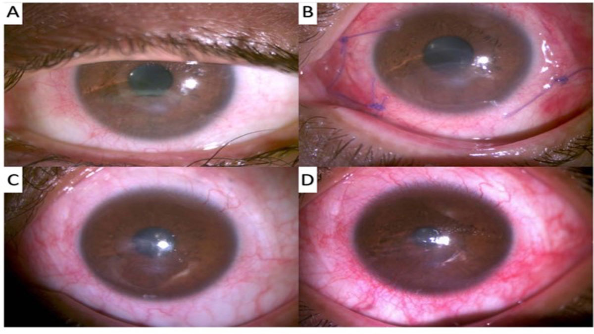 Figura 2. Fotografías con lámpara de hendidura de un paciente con antecedente de resección de craneofaringioma que ocasionó lesión iatrogénica de los nervios craneales V y VII, además de comorbilidades como diabetes mellitus tipo 1 y obesidad. (A)Imagen preoperatoria que muestra cicatriz central corneal con neovascularización inferior secundaria a queratopatía neurotrófica progresiva. (B)Fotografía inmediata tras la neurotización corneal. (C) Un año después de la cirugía, se observa mejoría en la cicatrización y en la neovascularización, con fascículos del nervio sural subconjuntivales próximos al limbo nasal y temporal. (D) Imagen a los tres años postoperatorios, tras un episodio de úlcera epitelial corneal resuelta, en la que se aprecia superficie ocular estable con cicatriz corneal central y sin defectos epiteliales activos.