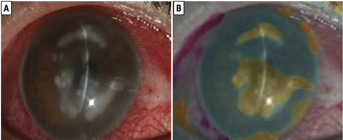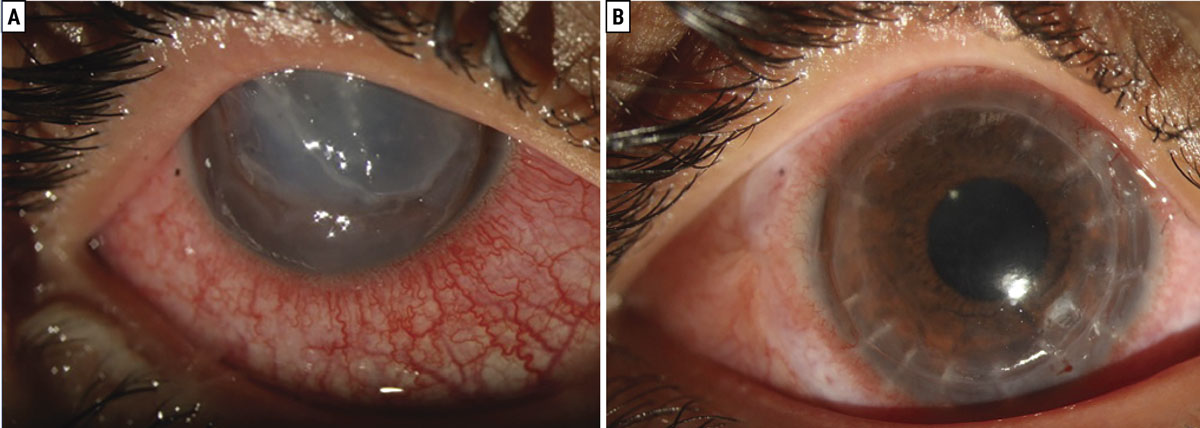 Figura 1. Caso de queratitis estafilocócica con adelgazamiento corneal severo tras cross-linking corneal (A), tratado con queratoplastia lamelar antes de la formación de cicatriz (B), con una agudeza visual final de 20/25. Imagen: Mohammad Soleimani, MD.