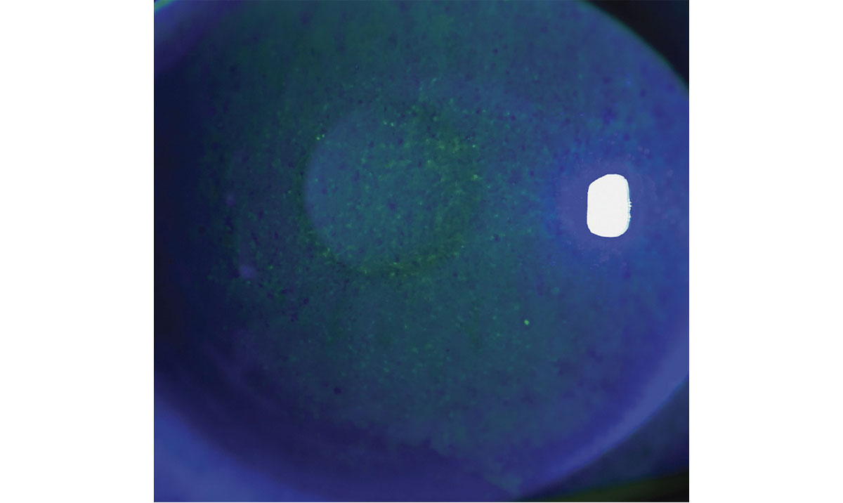 Figura 3. Imagen con luz azul cobalto del ojo mostrado en la figura 2 después de la instilación de fluoresceína, que evidencia queratopatía punteada superficial secundaria al ojo seco.