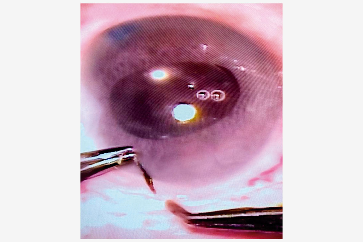 Ante este escenario, donde la dureza nuclear y la estrechez del espacio de maniobra hacían de la facoemulsificación una opción de alto riesgo para el endotelio, se optó por una MSICS con abordaje temporal para minimizar el riesgo endotelial y proteger la ampolla filtrante superior. Se confeccionó un túnel escleral de 7 mm para una extracción del núcleo sin estrés mecánico (Figura 5). Se implantó una lente intraocular de tres piezas bajo viscoelástico y se aseguró la hermeticidad con un único punto corneoescleral (Figura 6).