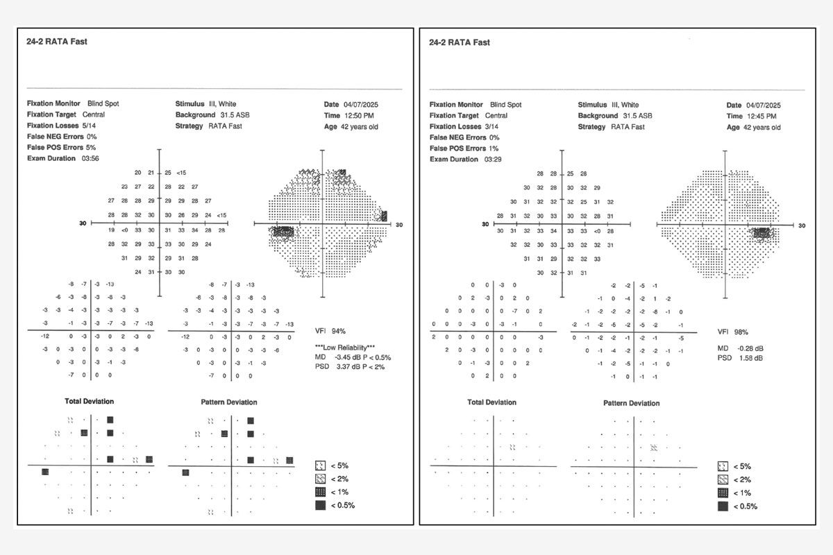 Figura 3. Un ejemplo de un mal candidato para un LIO multifocal. El ojo derecho de este paciente está bastante sano, mientras que el izquierdo presenta una enfermedad significativa. Aunque el ojo derecho está más sano y no presenta pérdida del campo visual, los expertos afirman que existe la preocupación de que acabe como el otro ojo y tenga problemas en el futuro. Fotos: Shivani Kamat, MD.