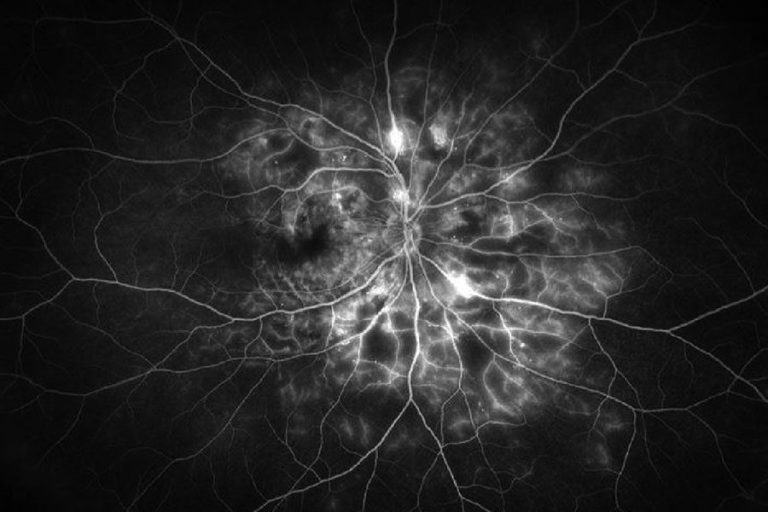 | Figura 4. Imagen de angiografía con fluoresceína de campo amplio del ojo derecho de un paciente con retinopatía diabética proliferativa, que muestra áreas hiperfluorescentes de tinción vascular y fuga junto con áreas hipofluorescentes de no perfusión capilar. Foto: Jason Hsu, MD. |